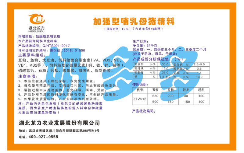 湖北龍力農(nóng)業(yè)發(fā)展股份有限公司坐落于武漢市黃陂區(qū)前川街向陽街群順三里298號附1號。公司成立于2014年6月,公司自成立以來把“創(chuàng)全球最大養(yǎng)豬綜合服務”為企業(yè)愿景。致力于打造教保料品牌”作為公司發(fā)展的明確目標。公司一直致力于豬營養(yǎng)的研究和開發(fā),積極與國內(nèi)外高校和科研機構(gòu)合作,推廣養(yǎng)豬技術(shù)、動物營養(yǎng)新概念,向世界農(nóng)牧企業(yè)學習與合作。公司采用國內(nèi)先進的生產(chǎn)工藝,選擇高精度電子配料秤,高均勻度、無殘留混合機等先進設備....